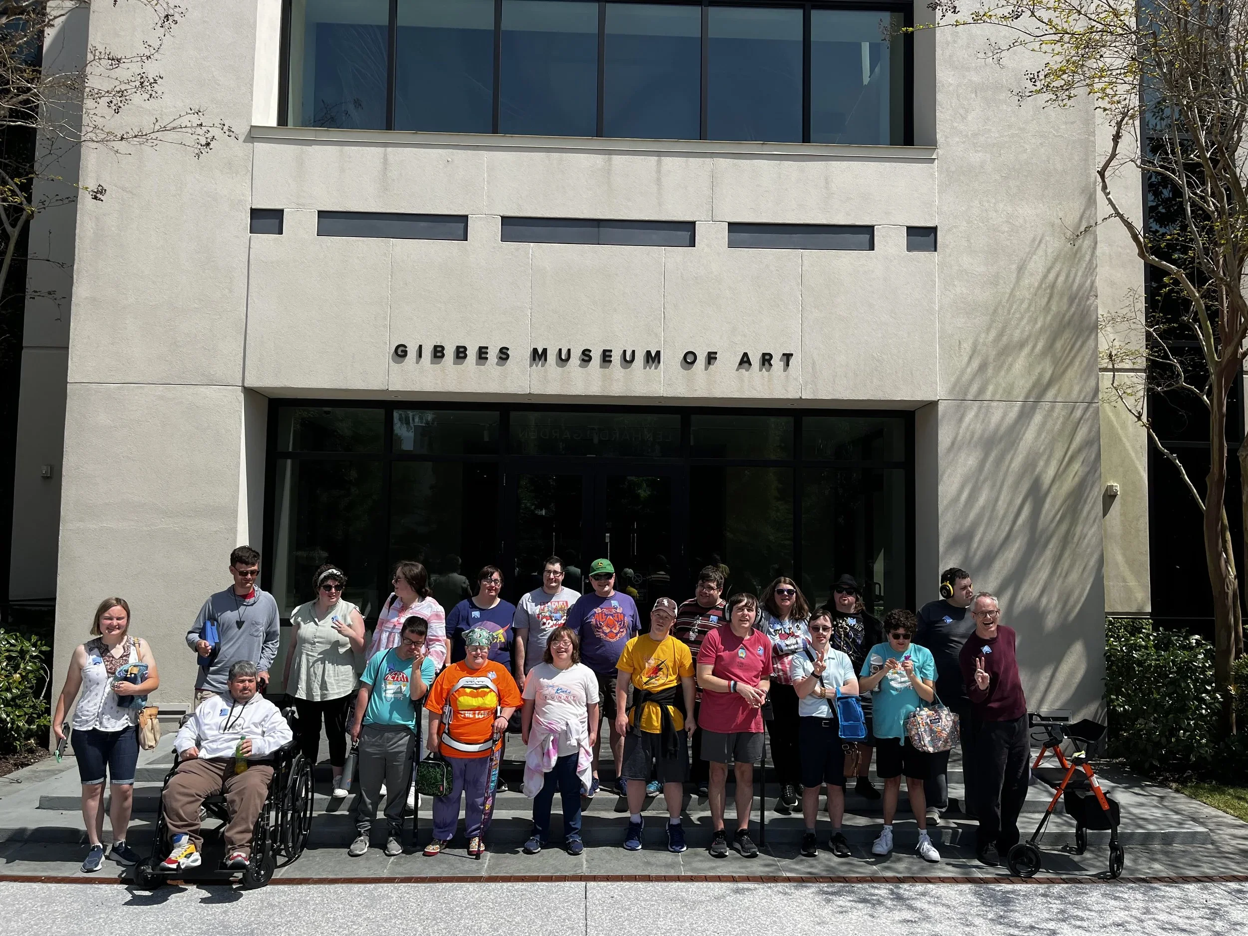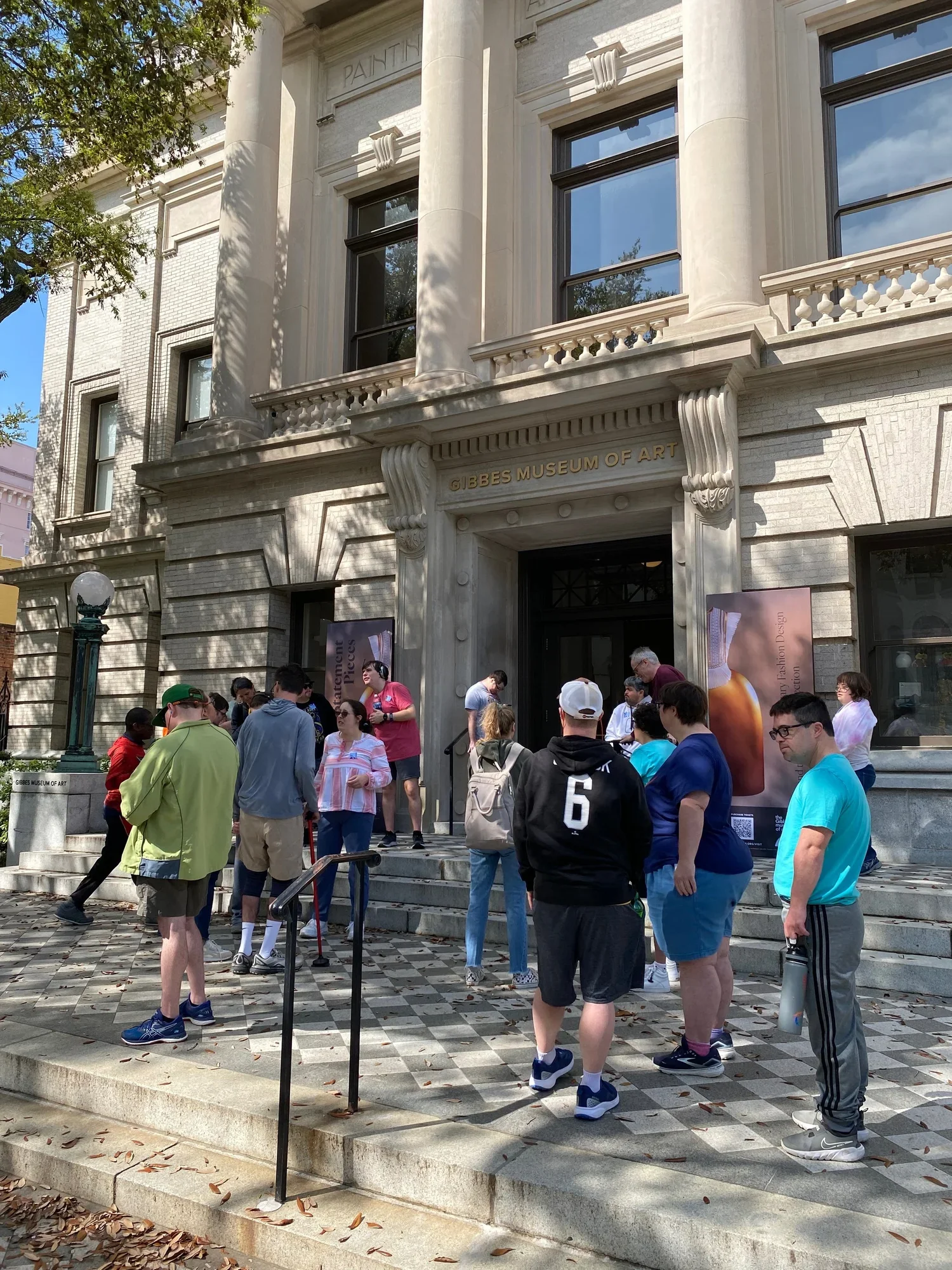 A large group stands together outside of a large building that reads “GIBBES MUSEUM OF ART” overhead.