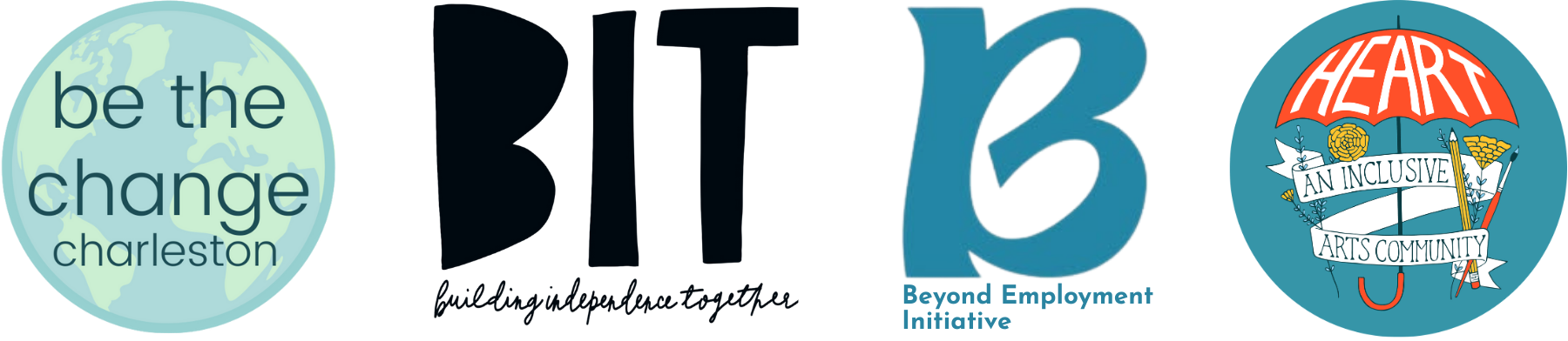 Four logos: 1: A round, pale-colored earth with text overlay that reads “be the change”. 2: Black block letters that read “BIT” with cursive text underneath that reads “building independence together”. 3: A teal, curvy “B” with text underneath that reads “Beyond Employment Initiative”. 4: A teal circle containing a red umbrella that reads “HEART”. A white banner flows over the handle and reads “AN INCLUSIVE ARTS COMMUNITY”.
